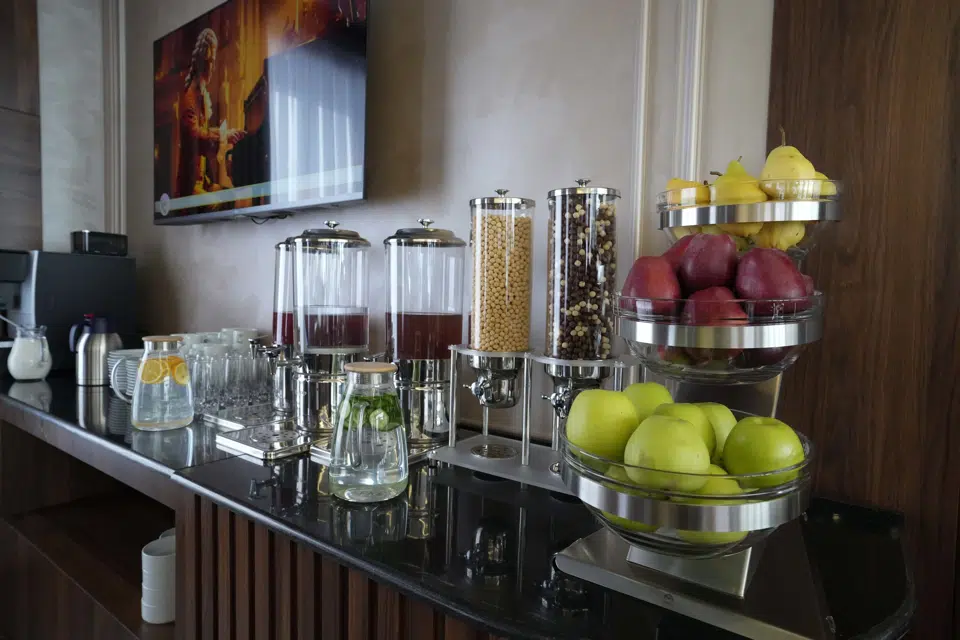 Каждое утро гостей ждёт разнообразный завтрак «шведский стол» с ароматным кофе, свежей выпечкой, фруктами и блюдами на любой вкус. В течение дня ресторан предлагает лёгкие закуски, блюда из свежих морепродуктов и авторские десерты, а вечером — изысканные ужины в романтической атмосфере с видом на закат.